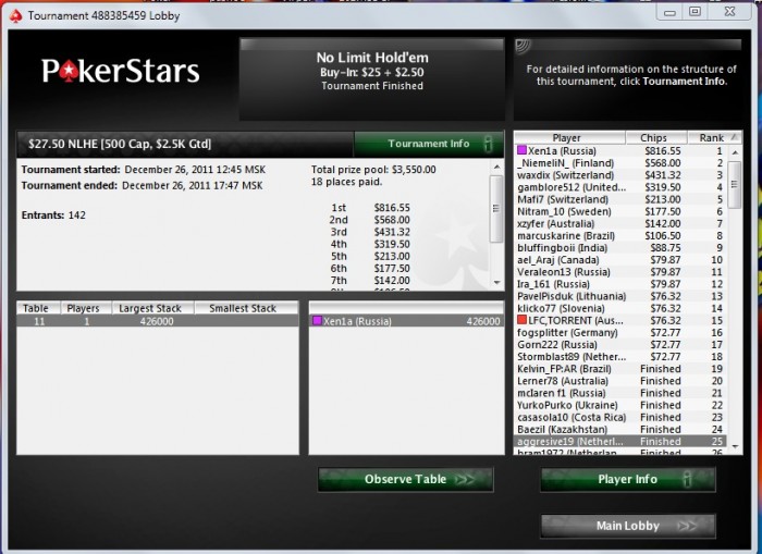 Ппц какая жара была сейчас!Днем села играть турниров несколько.Во всех шла хорошо!Остался один турнир самый дорогой немного не по бр) Фишка вся в том, что сегодня к 19,00 мне надо на др к подруге. И когда осталось нас 3 - начался ад. Оппы лузоватые, я даже себя ощущала на уровень выше. Решила делить только из-за того что надо ехать к подруге. НО сволочи отказались, после этого они меня разозлили и выбила их всех минут за 5) Счастлива!)Довольна, что все таки не поделила. Везет мне на такие поля дневные с участниками до 200))) Уехала к подруге отмечать ее ДР и свою маленькую победу) Опять первое место ура)