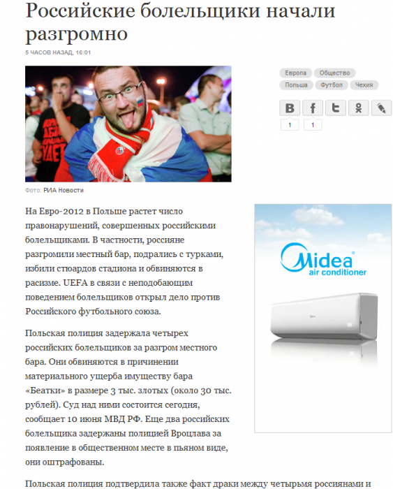 2-Рад, что хороший футбол показали поляки, россияне. То есть смысл всего этого чемпионата: "Продвигать футбол в нефутбольные страны" - срабатывает. На матче Голландия-Дания было очень много людей, которые не знают никакого на поле. Для них это шоу, это театр... И такой курс УЕФА мне нравится.