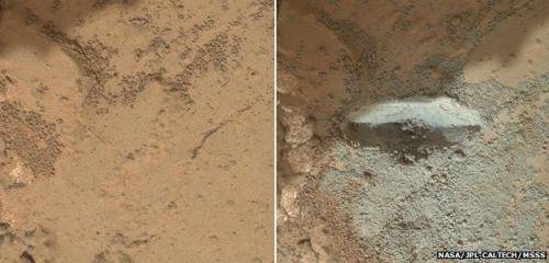 Объектом первого бурения аппарата стал плоский камень, напоминающий гипс. Он имеет прожилки, который могут свидетельствовать о существовании в прошлом на Марсе воды.