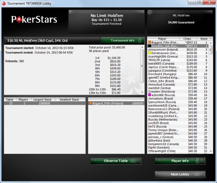 Poker Stars $5.00+$0.50 No Limit Hold'em Tournament - t150/t300 Blinds + t40 - 9 players