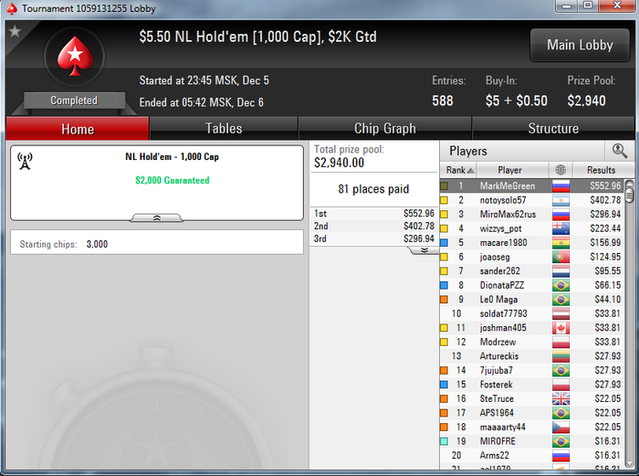 Турниры за 55 долларов я играл не так много, хотя бр давно позволяет, но я крайне консервативен в этом вопросе, я заливался дважды, это противно, больше не хочу . Как бы то ни было те турниры, в которых я участие принимал, не вызывали никаких проблем. Не хочу прыгать далеко, 55 - то что мне нужно в этом году.