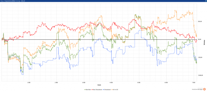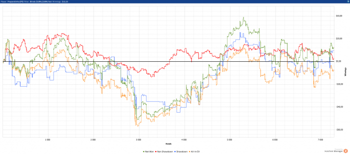 В заключении хочу написать пару советов для тех, кто никак не может побить нл2. Уделяйте много времени теории. Используйте программы для сбора и отображения статистики, например holdem manager 2. Что бы понимать что значит та или иная статистика не в цифрах, а в картах, работайте с покерстоувом. Не мудрите в раздачах. Оппоненты не поймут ваших мувов. Не играйте много столов. Вам нужно учиться думать, а не дистанцию наигрывать. Не обращайте внимания на красную и синюю линии, главное что бы зелёная шла в плюс. Не парьтесь особо по поводу вашей статистики и как вас видят оппоненты. Очень мало людей используют на этих лимитах программы для сбора статистики. Не играйте в нитовом стиле. На нл2 вам может и позволяют плюсовать в таком стиле, но расширять свои диапазоны всё равно придётся со временем и с ростом лимитов. Поэтому учитесь сразу играть в стиле 22/18/8. Ваша задача на нл2 ловить сильные руки и собирать велью с рук хуже, а когда никуда не попадёте, то забирать всё это дело цбетами. Уделяйте особую роль блайндам. Старайтесь стиллить их как можно больше пока вам позволяют оппоненты. Блайнды по сути составляют основной проигрыш или нулевую игру у стандартного графика в виде ёлки. Наверное самое главное, учитесь объяснять каждую вашу ставку. Например, многие ставят цбет, потому что им так в водах сказали. А нужно ставить: 1) На велью 2) В блеф 3) Забрать мёртвые деньги. Если ставка не подходит ни для одного из этих пунктов, то ставить не надо. Вот в каждой раздаче и на каждой улице вам нужно учиться так думать.