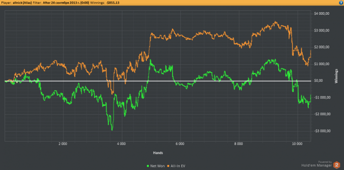 После этого я безумно радостный такому развитию событий, переключился на другого игрока. Он так же играл с 3бетом 30-40% и в целом я обыгрывал его спокойно и без напрягов, первое время. Он играл еще один стол 2/4, правда в чате не отвечал совсем, потом с другим регом начал играть 1/2. Я вел около 8-9би, как он перестроился и поменял игру, в итоге ему удалось отбиться и я был слегка подавлен, но радовало то что он не хотел уходить и стабильно докупался. Я постепенно пытался вернуть дипстеки и очень обрадовался когда рег выиграл 4би просто взял и ушел, я сразу же прыгнул к нему на второй стол и мы продолжили на двух столах. Там и пошел камбек, он снова начал играть очень плохо и мы устроили бойню )) В итоге с ним мы начали играть около 3х и закончил я в пол 12го.