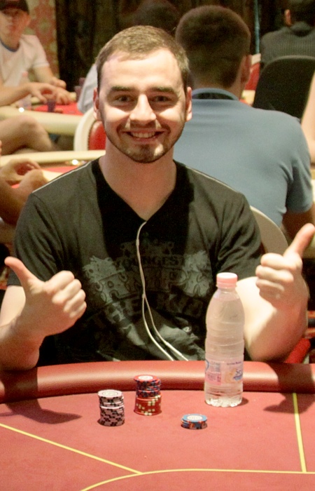 Алекснадр Филин выбил французского дедушку. Тот мужественно держался с коротким стеком три дня, но вдруг решил сквизануть с баттона на . На его беду у украинца оказались , и он поставил свой олл-ин. На доску легли .