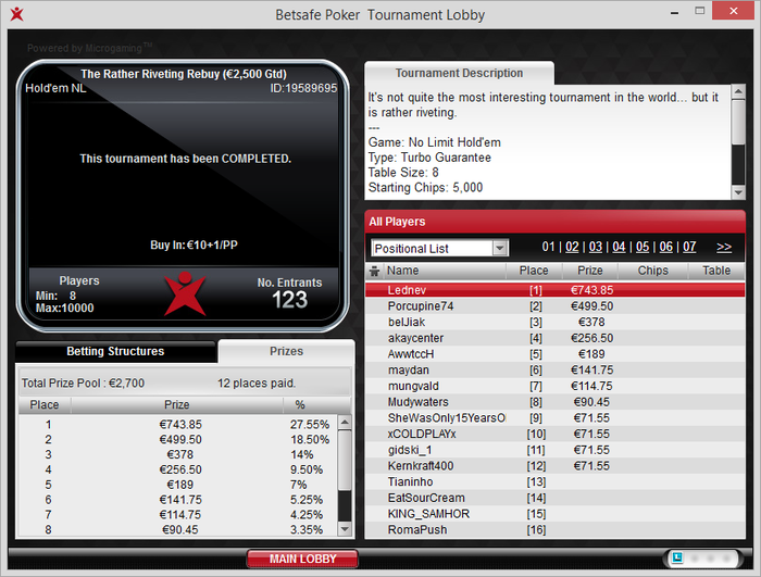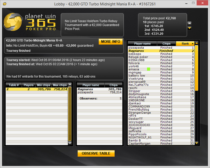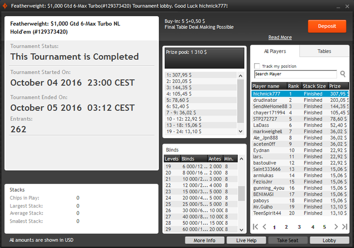 Однажды когда-то давно, когда еще моей основной дисциплиной были мтснг, мне удалось сделать самый эпичный камбек в карьере: выиграть турнир, раскрутившись с 0,5бб. Но то было мтснг. Сегодня удалось сделать еще один крутой камбек теперь уже в мтт, раскрутившись с 1700 фишек (1,7бб) до почти 8 миллионов и соответственно выиграть скромный турнир. Еще в проклятом ребайнике немного не доехал. Ну и пятая сессия подряд в плюс.