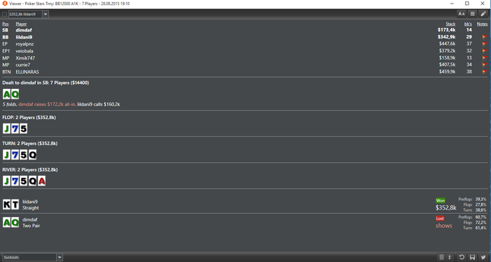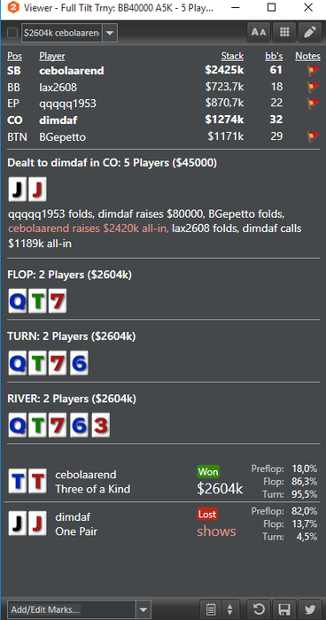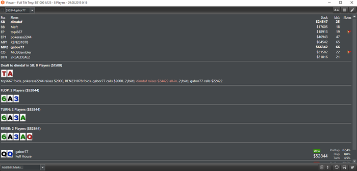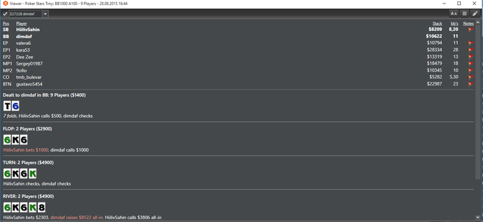 dimdaf, Я прекрасно понимаю о чём ты говоришь, и что за пацаны в той раздаче. Я знаю их, я матерей их знаю. Ладно, шутка. Ну ок, закрылись по тёрну их любимые А3сьютовые, ну выкидывай уже) 4бб в таких стеках не такая уж и потеря. Не переигрывай. Не придумывай им блефы, когда у него статы 65/9 и он хуярит на флопе. Если после нас много коллеров, то я лучше сыграю с 99 3бетом против утг и выкину на дальшейший экшен, зато сразу пойму что девятки уже не очень годятся. Надо смотреть что за парни за столом. Трудно оценить ситуацию так