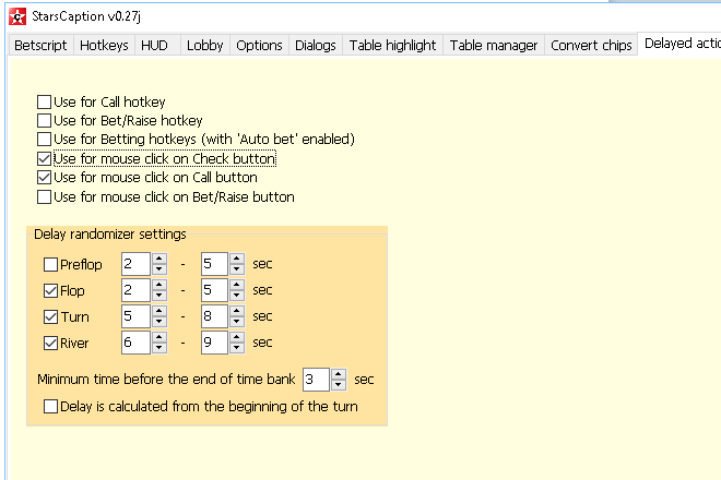 3) Ты имеешь в виду Betting hotkeys? В принципе я могу переделать их под вариант, реализованный в Party/888Caption - там их можно делать в любых количествах. Но тут их можно и в клиенте PokerStars сделать, при желании - там тоже есть похожий вариант. Если же тебе по какой-то причине удобнее настраивать их в StarsCaption, или тебе нужны относительно сложные формулы, которые не реализуются через клиент - ок, я могу подумать над этим (в принципе в плане это есть, но по описанным выше причинам я не очень тороплюсь это делать).