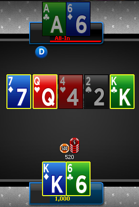 Далее другой выиграл сравнение, на префлопе выставившись QT>AK