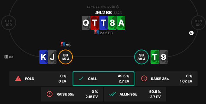 Кто-нибудь логику солвера может тут объяснить? Почему 50% чек пуша? Линия была чек/кол 30% по рнг флоп, чек кол 66 тёрн. А тут аж половину хочет пушить на потбет. Почему? Половина низких трипсов в блеф пуш, чтобы стрит как раз напряч?