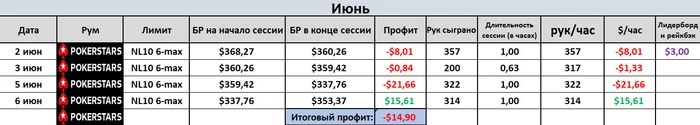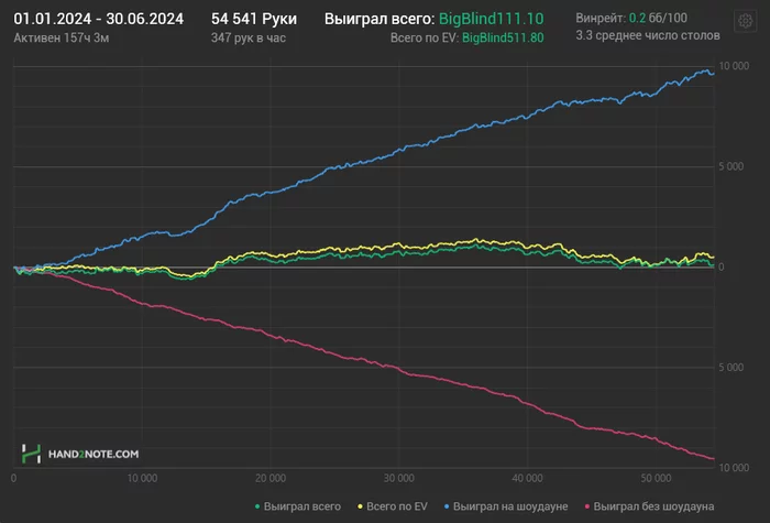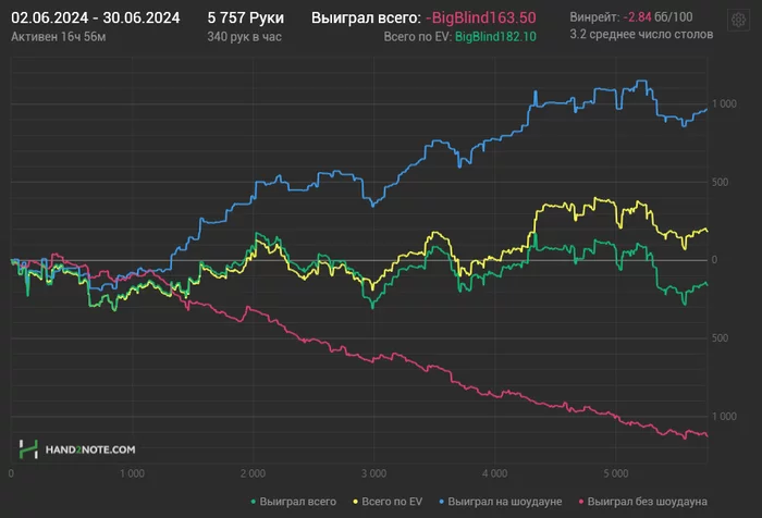 Стартанул с пары откровенно хреновых сессий. Очень недоволен игрой. Поразбирал раздачи и понял что слишком много хиро херовых коллов наделал. Но вот крайней на данный момент сессией доволен полностью. Все линии на графике были вверху. Кстати, решил в недельном отчёте график и ВР не выкладывать - не вижу смысла. Поэтому кратенько