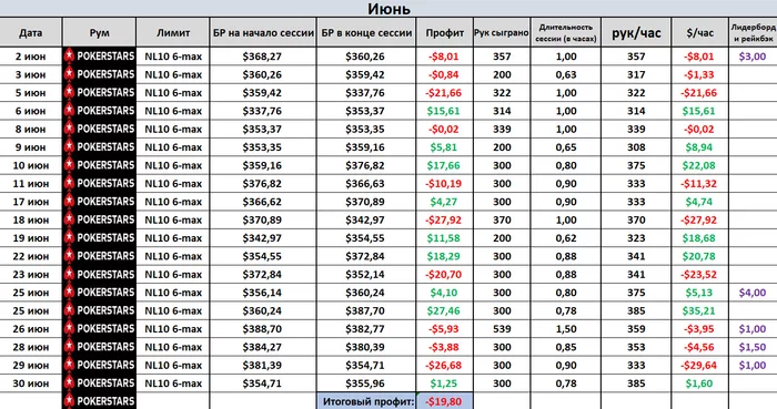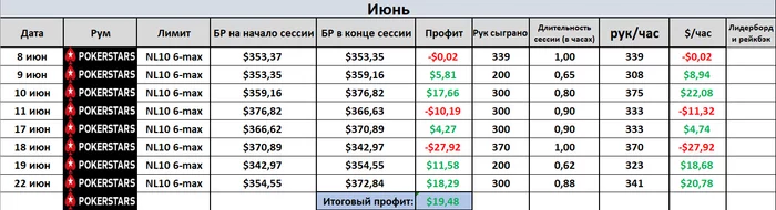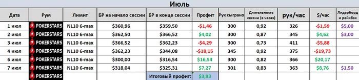 Как видно из таблицы, 5 июля пришлось вывести приличную часть банкролла. После отпуска ЗП получил небольшую и пришлось залатать эту небольшую дыру с помощью покерного БРа. Теперь он такой