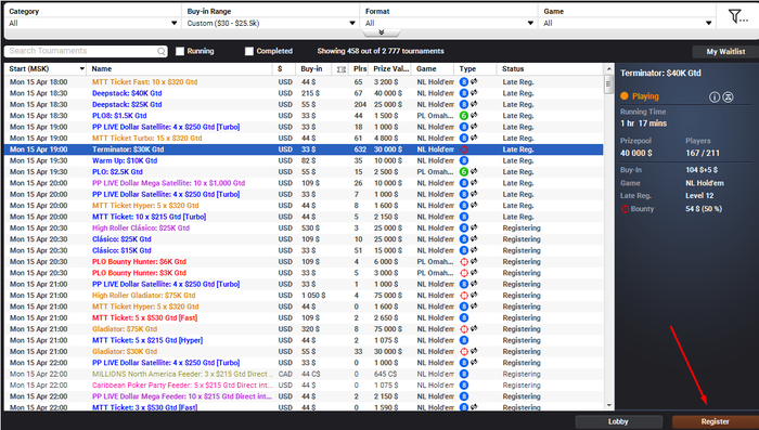 2. При разворачивании лобби рума выделение перескакивает с одного турнира на другой (если список немного сдвинулся из-за того что в верхние турниры закончилась регистрация). Если поспешить, то можно зарегистрироваться в другой турнир.