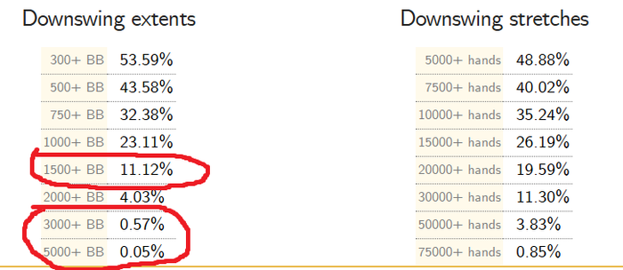 1500 бб всего в 11 раз больше, чем тебе кажется, хоть это и не совсем та цифра, если я правильно понимаю (The first one shows how often the simulated player was in the middle of a downswing of at least X BB). Ну и 4000 там где-то между 0,05% и 0,57%, что-нибудь типа 0,15%.