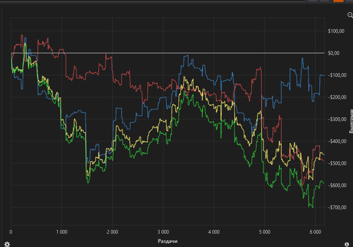 Забив это в калькулятор как я ни пробовал, не смог почтитать вероятность залива 4000бб на 50к рук. Там есть залив 1500бб с вероятностью 1%. Реги лучше играть не стали, фишей не убавилось...если считать с фишеботами рума чекбихающими топ фуллы ривер, когда мы впереди