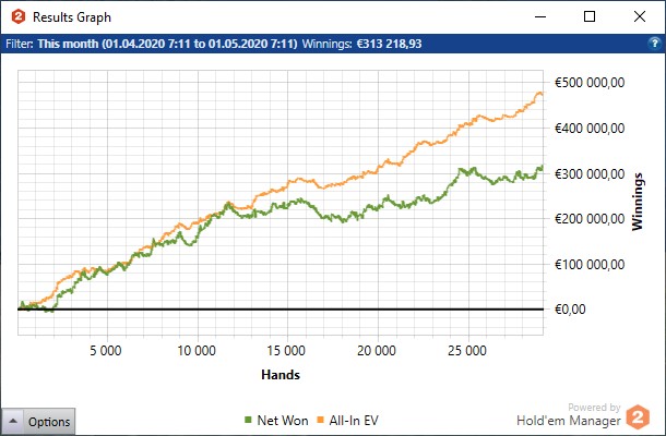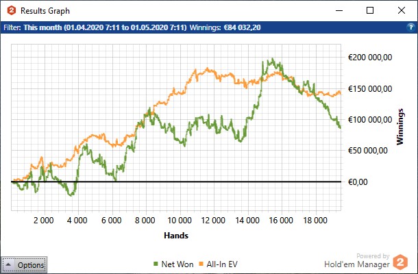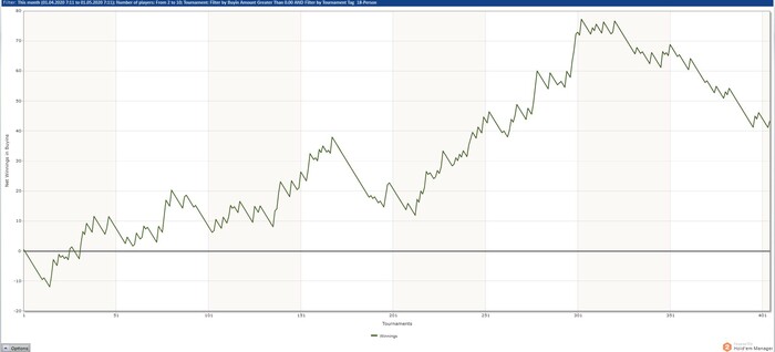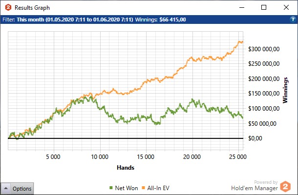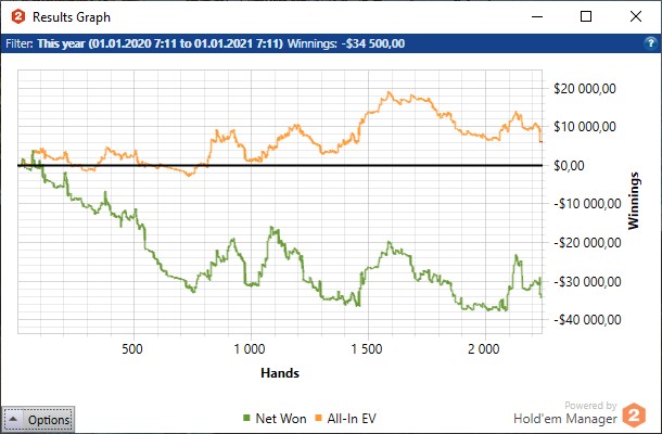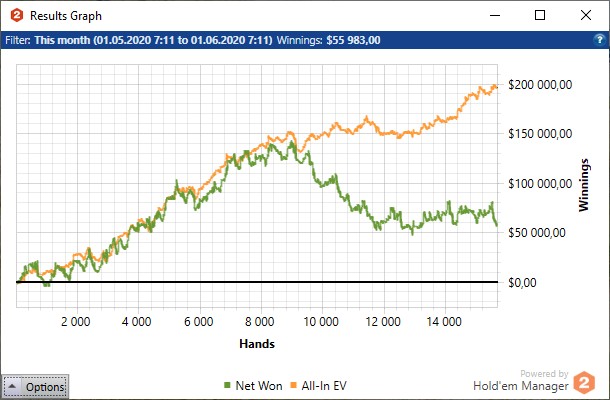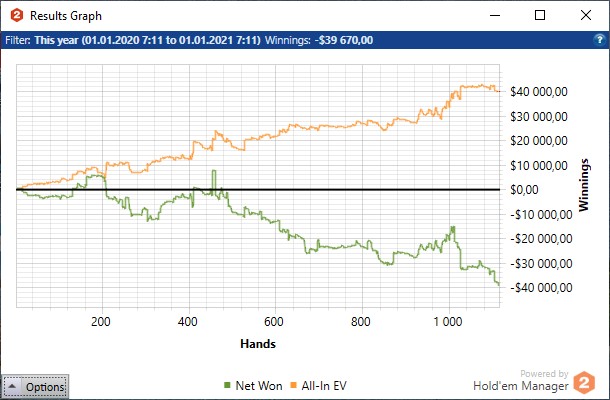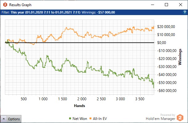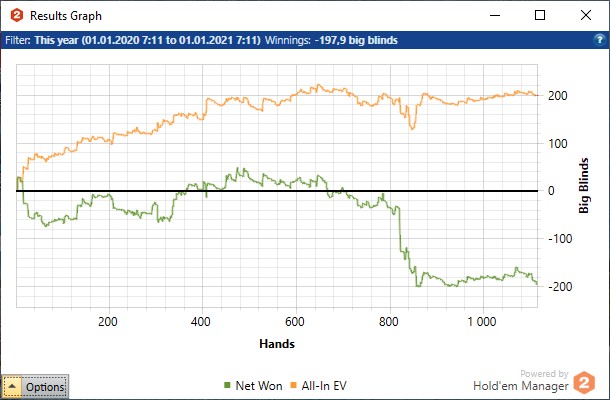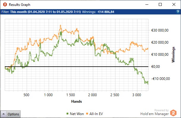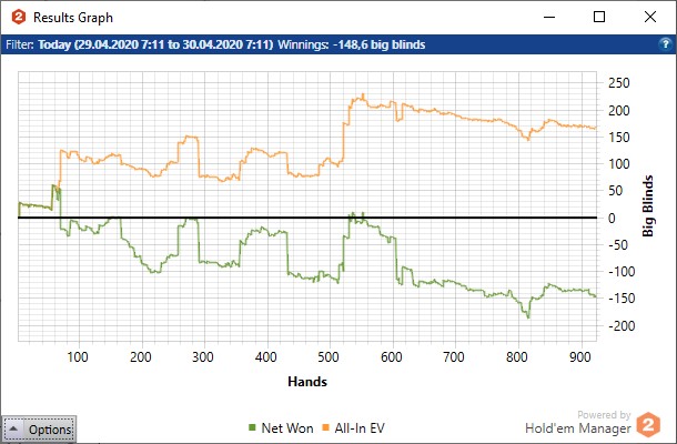 И это только один турнир. Например, начало сессии было вообще супер. В первых трёх турнирах я шёл уверенным чипаком в стадии топ-5 и во всех трёх вылетел пятым. Ну такое даже в страшном сне представить невозможно. И самое главное, что никому ничего не докажешь (дисперсия и т.д., и т.п., на самом деле уже достали все кивки на неё, нет никакой дисперсии, есть только вечная жопа у одних и вечный ап у других), и совершенно непонятно, что делать. Потому что сам повлиять ни на что не можешь. Я могу катать по 14 часов в сутки (к слову, я так и делаю), но если при распределении плюшек при рождении мне досталась вечная жопа, то хоть по 28 часов в сутки я буду катать, она никуда не денется.