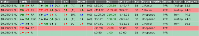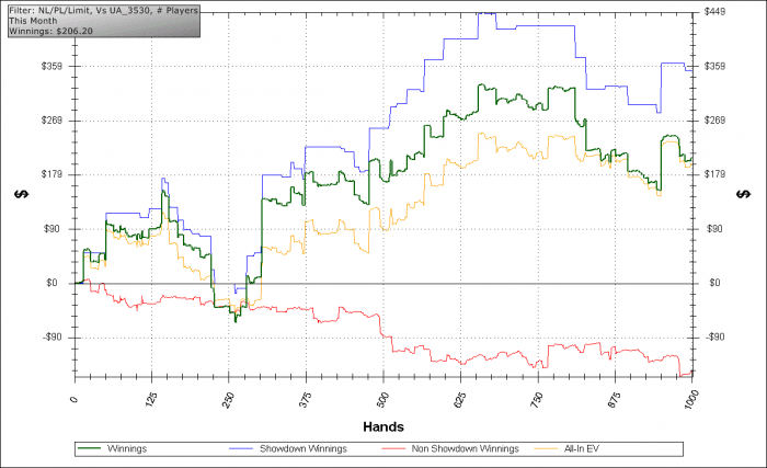 А вчерашний график отражает не изменения в стратегии (во всяком случае я их не заметил), а время в которое матч должен был уже закончится, если бы начался вовремя. Время когда мой желудок отказался больше откладывать прием пищи, а после ужина мозг занялся исключительно перевариванием съеденного, что и привело к моей не самой лучшей игре. Хотя, если не считать того случая, где я проирал дополнительные 80$ c 10 8, думая, что у меня стрит(чего со мной не было уже давно), на результате это больше почти не отразилось.