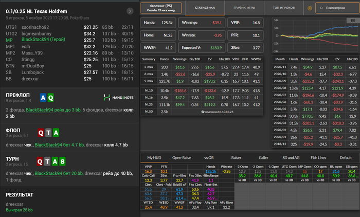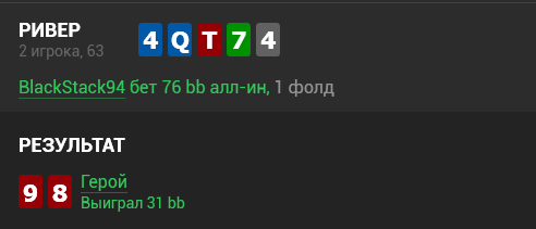 Хотя сейчас я не уверен, ошибка ли это. В ХАДе у оппонента 3-бет был еще ниже. Заложил ему туда все АК и QQ в придачу, и вместо того, чтобы зарядить посильнее, испугался маленького кусочка JTs в 4 комбы. Вторые и третьи пары и так должны отлететь на ривере, если не отлетели раньше, допперы и сэты заколят и крупнее, а в ответ запушит только стрит. Думаю, где-то 30bb на дистанции не добрал. Сейчас бы склонялся к крупной ставке и фолд на пуш или же самому пихнуть