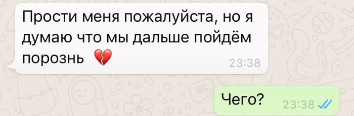 Блять, я покатаю когда-нибудь нормально или нет. Причем, ладно если бы я ждал этого сообщения, но когда ты сегодня видишься с человеком, переписываешься, все нормально, говоришь что идешь на катку, и тебе желают удачи, а спустя полтора часа ни с того, ни с сего ты получаешь такое. Пытаться понять женщину - тоже самое что пытаться построить диапазон фиша 54/12 с донком флопа 39 и чек-рейзом терна 15