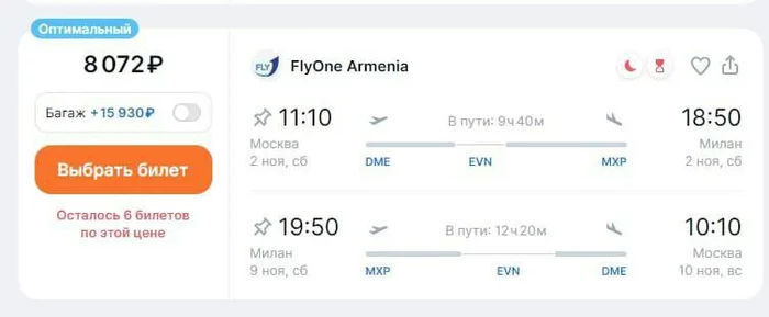 HuanXIV @ 23.10.24В целом если покупать что-то типа Москва-Рим-Москва, или Москва-Барселона-Москва, или даже Москва-Хельсинки-Москва, то это будет стоить что-то типа 90 - 100 тысяч рублей на человека.