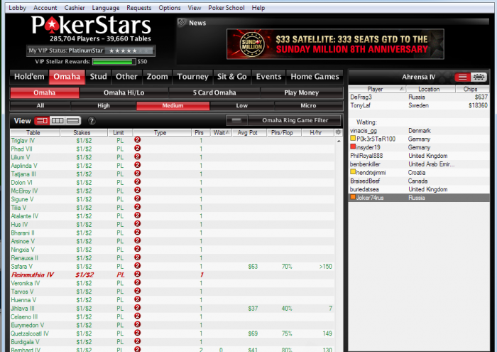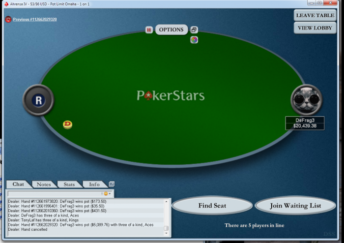 Poker Stars, $5/$10 Pot Limit Omaha Cash, 2 Players
