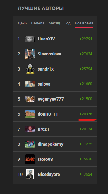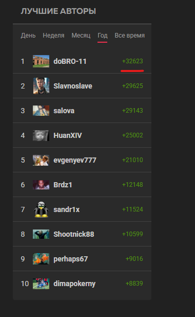 Например: у doBRO-11 за год плюсов 30к+, а за всё время 21к.