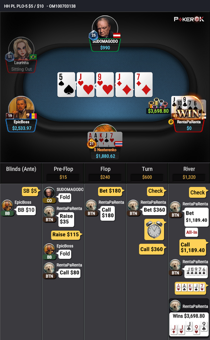 zloy20, А мне понравилось, как ты рассказал, что у оппонента оказывается вагон эквити против ренжа, хотя кажется, что он упал лицом на случайные кнопки клавиатуры, и вышла вот такая раздача. 5 карт иногда создает ощущение, что как-будто прощает любой префлоп и лайтовые пилы типа этого. Но это ощущение быстро проходит, когда тебя раз за разом ушатывают доминации и более сильные руки. Так что приходи еще и подвози мысли - в этот раз ты вообще больше всех вклада внес в обсуждение, так как единственный, кто вообще открыл калькулятор и добавил какие-то цифры в дискуссию.