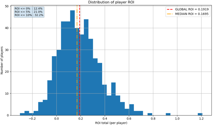 1) Средний доход аллиаса всегда перекошен в сторону больших заносов. Если взять статистику норм регов с общим РОИ ~19%, и посмотреть резалты на дистанциях в 2500+ турниров, то у медианного рега будет еще меньше, чем у "среднего", на пару процентов.