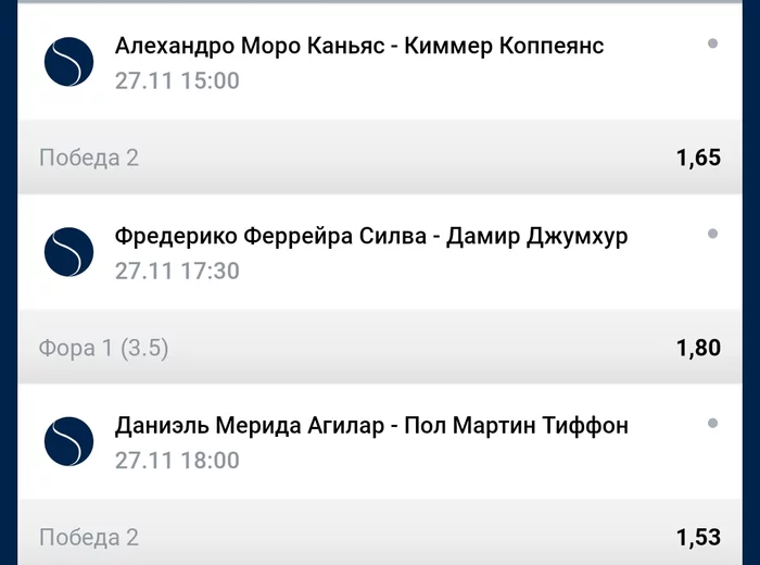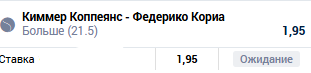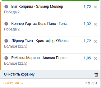 нуууу.. пытаемся найти оправдание прессу.. коприва мне не нравится как теннисист, не стабильный он. опять 3 сета.. более свеженький и техничный молодой норг должен титул забирать. вижу юбенкса и 22.5 1.7-1.8 беру. марино паркс, это какой-то парад подач, розыгрышей в 2 удара. куча сеток и аутов.