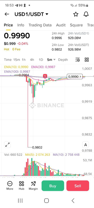Сейчас обвалился стейблкоин Трампа USD1 - в моменте падал на 2% до 0,98.