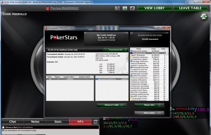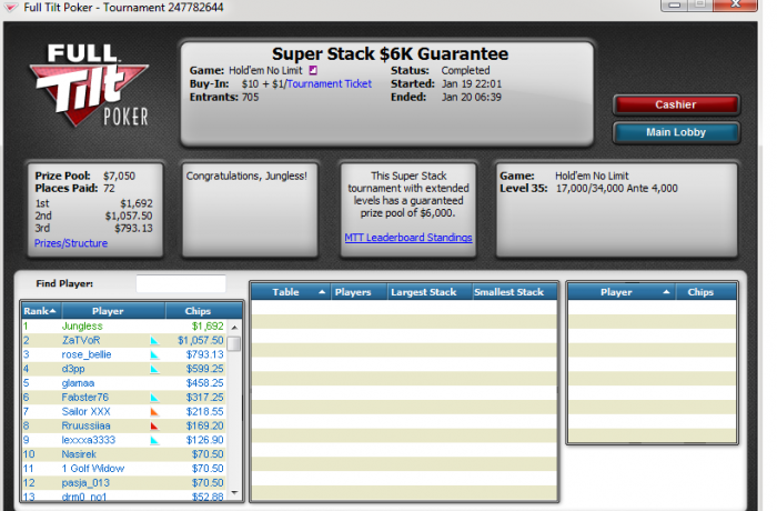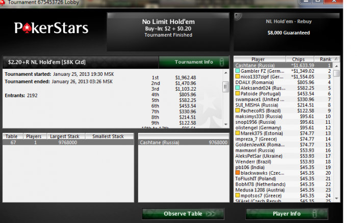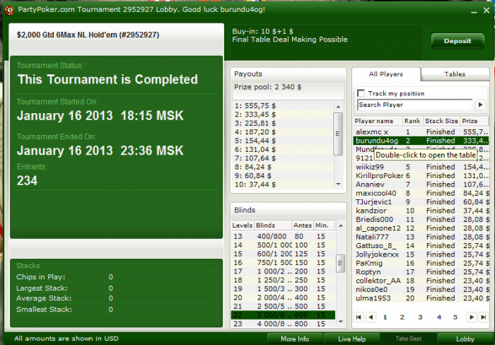 Занес за три дня три специфических турнира 10 игр. 247557890 15 января, 10:01 ET Десять на десять $ 10.00 + $ 1 48 1 $ 177,60 247612240 16 января, 10:01 ET Десять на десять $ 10.00 + $ 1 59 1 $ 194,70 247666818 17 января, 10:01 ET Десять на десять $ 10.00 + $ 1 46 1 $ 170,20