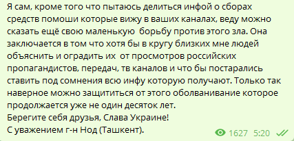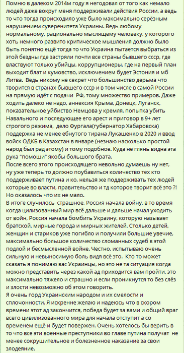 Украинцы сделали очень много шагов на встречу русским родственникам и знакомым в эти 2 месяца. Вы отмахивались руками, не верили нам что умирают очень много людей с ОБЕИХ СТОРОН, ссорились, ругались, но я вижу что правда выходит наружу все больше, все больше граждан пробуждаются, высказывают позиции против власти и их действий, все больше русских блогеров сами разоблачают русские фейки и разбивают пропагандистские слоганы, все больше появляются независимых СМИ которые не бояться спросить честное мнение обычных прохожих.