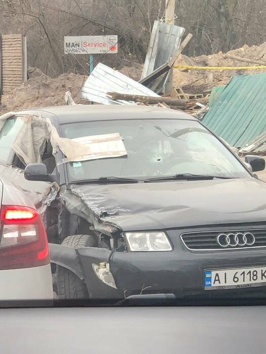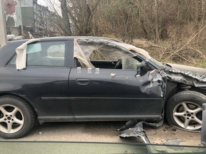 Машина тоже осталась, подлежит восстановлению, но внешне многое в сколах и под замену, заднее стекло выбито.