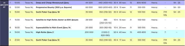 В 15:00 начнется Sochi Poker Cup 1В с бай-ином 350 у.е. и уровнями по 20 минут. В каждом из пяти флайтов турнира сыграют до ИТМ.