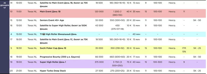 Обратите внимание на крайнюю правую колонку в таблице расписания. В ней указано, в каких турнирах со старта можно взять добавку к стеку "за чай": за 25-75 у.е. чаевых персоналу во многих турнирах можно получить дополнительные 5,000 фишек к стеку.