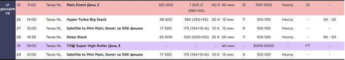 Обратите внимание на крайнюю правую колонку в таблице расписания. В ней указано, в каких турнирах со старта можно взять добавку к стеку "за чай": за 25-75 у.е. чаевых персоналу во многих турнирах можно получить дополнительные 5,000 фишек к стеку.