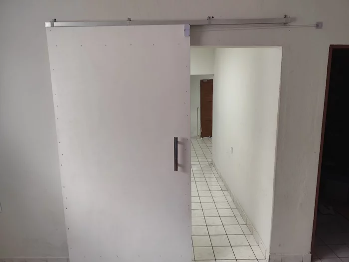 Соорудил раздвижную дверь с автозакрытием. Осталось только чёрные рейки приклеить на месте саморезов