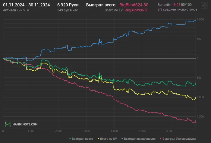В плане покера могу сказать, что ноябрь выдался, наверное, худшим, в первую очередь, по уровню игры. Много ошибок было, остался на плаву только благодаря кэшбэку в виде Cardex.