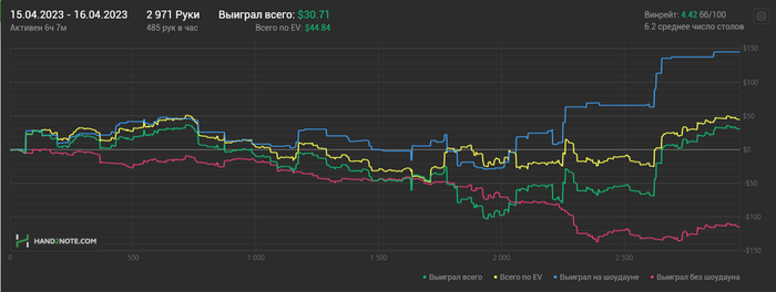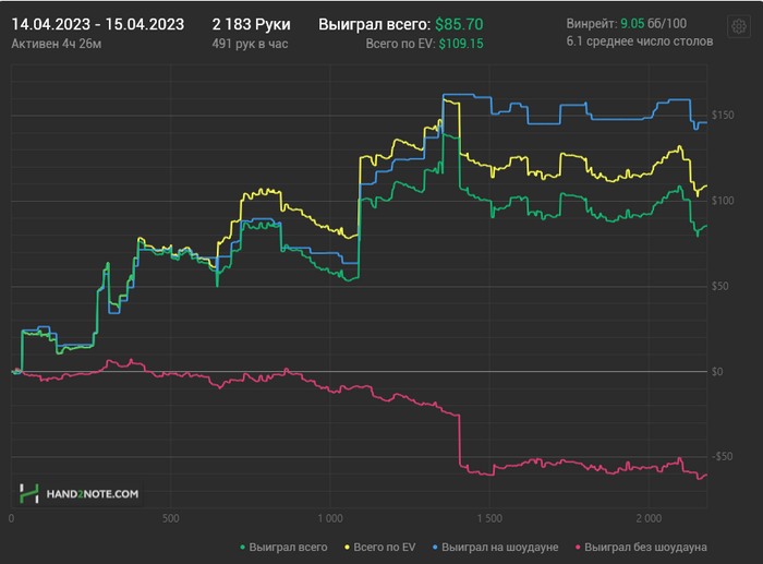 15.04.2023: 4.26ч, 2183 рук nl10/25 +$69