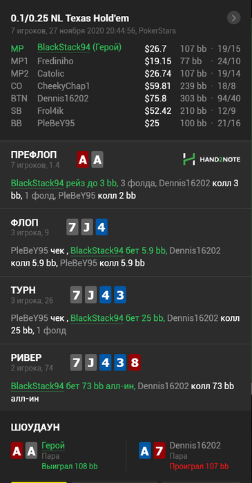 ⦁ ПОКЕР Вот сегодня прям ничего особенного. Игралось легко без каких-либо трудных решений. Даже мои переезды были обусловлены обычными кулерами, типа АК против КК коротышки-хобби, или выставление на терне при СПР 0.3, когда закрылись дро, но у нас сэт, и мы выставляем на фулл/карэ. Диспа сегодня благоволила, отдаем ей должное