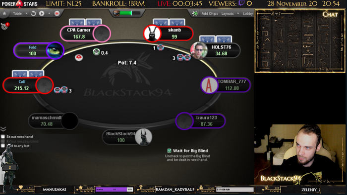 BlackStack94 @ 11.6.2020 Какие дальнейшие планы? Совсем скоро я начну подключать NL25 (ебаааа, это внатуре я пишу?!). Но прежде я вынужден сделать небольшой кэшаут в $100-200, ну а затем буду подключать NL25. Конечно, мне страшно. Я никогда не играл этот лимит. Очень хочется подольше задержаться в зоне комфорта. Порой мне дико представлять, как реально улететь на $150-200. Благо, консервативный БРМ способен сгладить такие периоды. Я скажу честно, играть буду как всегда под фишей, стараясь по возможности избегать регов. Первые пробы NL25 я точно не буду стримить. Буду рад любым вашим советам относительно игры на 25ке!