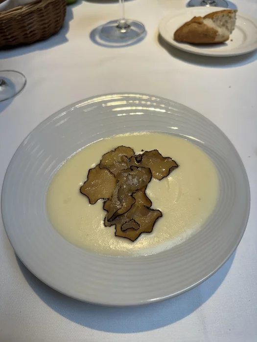 Пюре с кубиками бекона (внутри, не видно), с желтком яйца (внутри, не видно) и кусочками трюфеля (сверху нарезан, видно). Позиционируют, как традиционное блюдо ресторана, с 1985 года готовят. Очень вкусно.