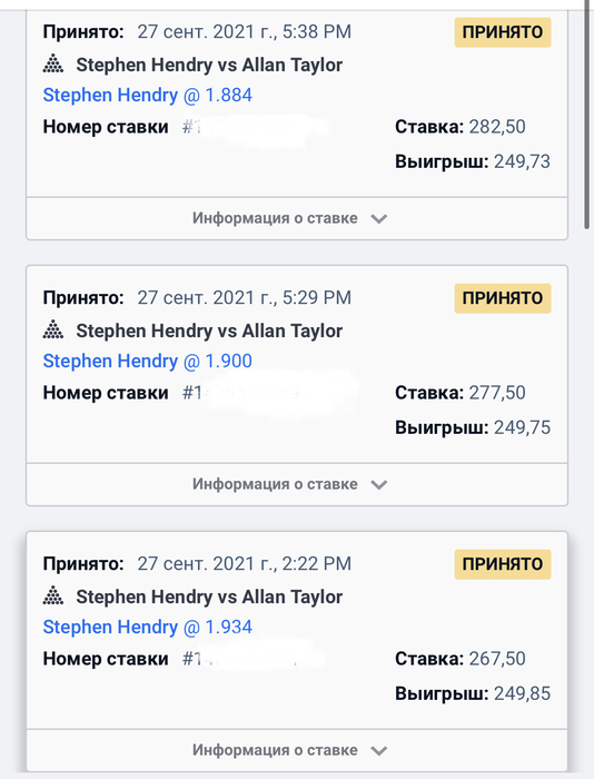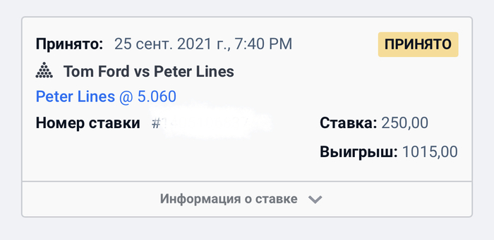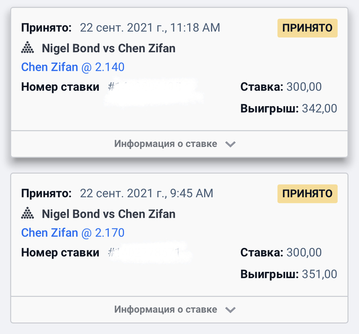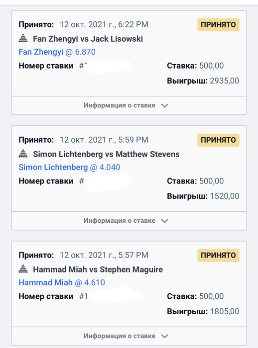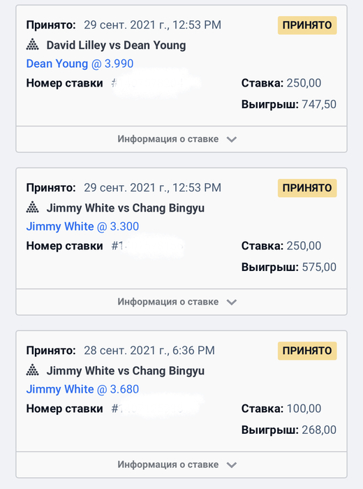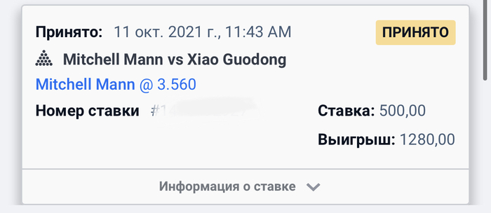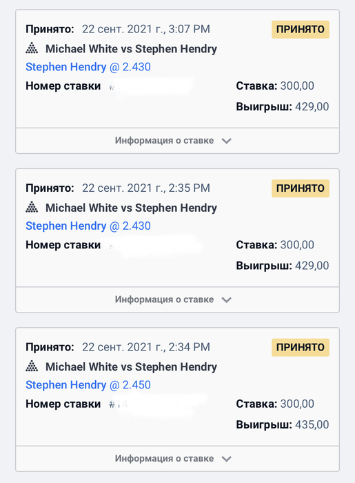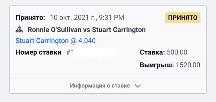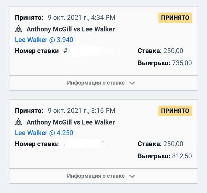 Короче, если вдруг кто-то ставит снукер в пинке и читает меня сейчас, давайте договоримся, не брать по ранней линии. 100$ ушатывают линию с 2.2 до 2. Перед матчем, конечно, тоже особо не разгуляешься, но там хотя бы можно несколько раз прокликать, и влияние этих 100$ будет не так сильно.