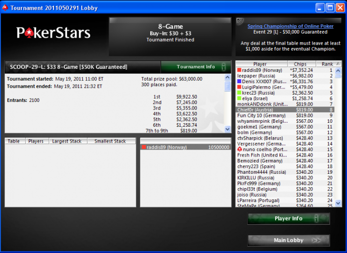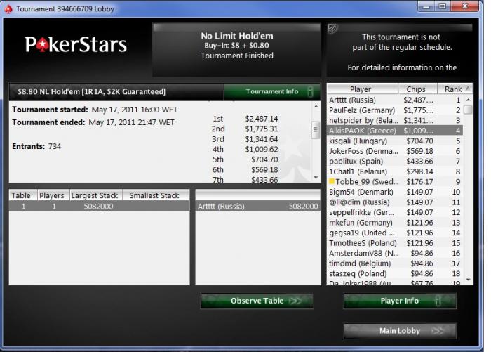 Lee @ 20.5.2011 Увы хедз-ап не покорился. Часы прошли мимо. Все таки стад моя самая слабая игра, да и против оппа который два раза собирал сет против моей стартовой оверпары тяжело играть.