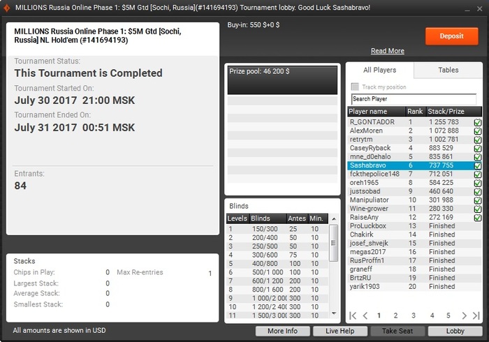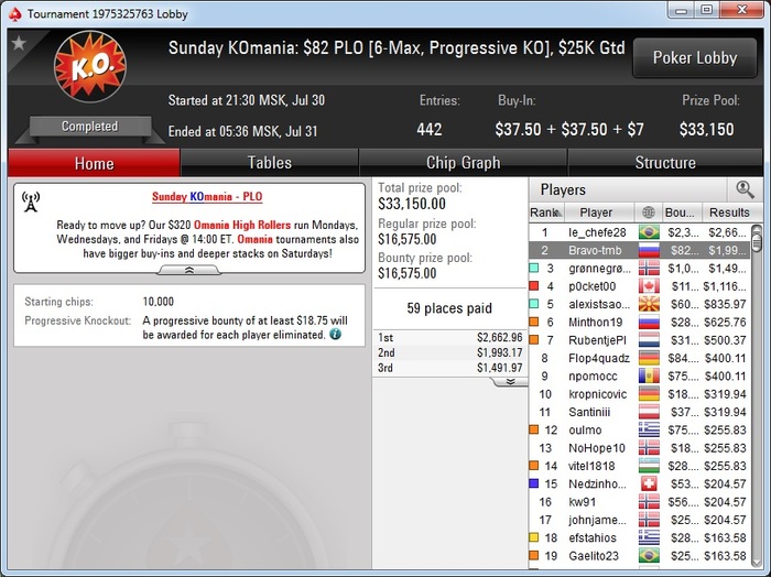 А вчера играл турнир по омахе за 33к рублей. К сожалению стек к финальному столу был очень очень короткий, на предфиналке проиграл аллин за 2 средних, но в призы(он же финальный стол) все же прошел. С финального стола выбил двоих коротышей, но затем < и 6 место. За первое было 550тысяч рубликов, я получил чуть больше ста.