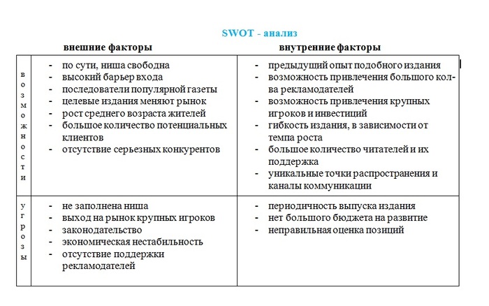 Таким образом, мы можем сделать вывод, что не смотря на общую нестабильность, как в стране, так и на рынке печатных изданий, а так же наличие нескольких прямых и косвенных конкурентов, у «Полезно для пенсионеров» есть огромный потенциал для развития и создания собственной ниши, в которой он и будет являться лидером и наращивать свои лидирующие позиции.