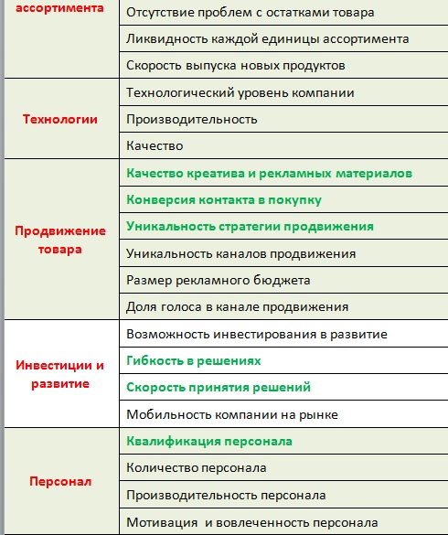 Какие свойства товара ценятся на рынке ? -Эффективность решения главной проблемы клиента -Качество -Уровень сервиса и пост продажного обслуживания -Образы, сформировавшиеся мнения и имидж, улучшающие восприятие товара -Уровень знания товара на рынке -Уровень лояльности к продукту -Гибкость в отношении ценовой политики -Чувствительность целевой аудитории к росту цен -Эффективное ценообразование -Качество креатива и рекламных материалов -Конверсия контакта в покупку -Уникальность стратегии продвижения -Гибкость в решениях -Скорость принятия решения -Квалификация персонала