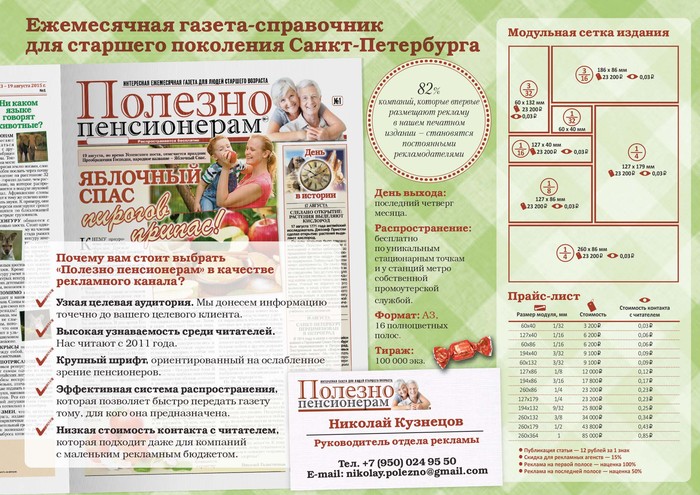 Газета «ПП» - это печатное издание, ориентированное на пожилую читательскую аудиторию. Издание является последователем известной газеты «Полезно для пенсионера» , которая успела завоевать лидирующие позиции на рынке печатных изданий, но закрылась по решение учредителей в июле 2015 года. Формат газеты – А3. 16 полноцветных полос. Выходит 1 раз в месяц тиражом 100 000 экземпляров и распространяется по уникальным точкам распространения. Цели создания издания: