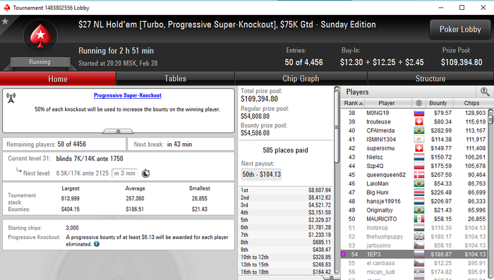 PokerStars - $40+$4|250/500 Ante 60 NL - Holdem - 9 playersHand converted by PokerTracker 4MP+1: 28.28 BB (VPIP: 16.67, PFR: 16.67, 3Bet Preflop: 0.00, Hands: 18)
