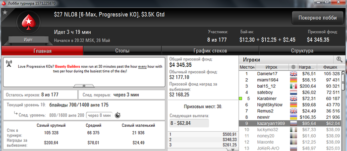 Не люблю когда тихо в блоге))) Сегодня откатал небольшую сессию. В общем не доволен, т.к. много не добирал в поздних стадиях. Причем проигрывал слабым оппам. В итоге все равно откатал сессию в +450$. Топ-4 Топ-2 Недоезд на предфиналке Причем сам сделал ошибку, выставился префлоп, чтоб выбить игрока. За его голову давали 60$. Но не доехал(((