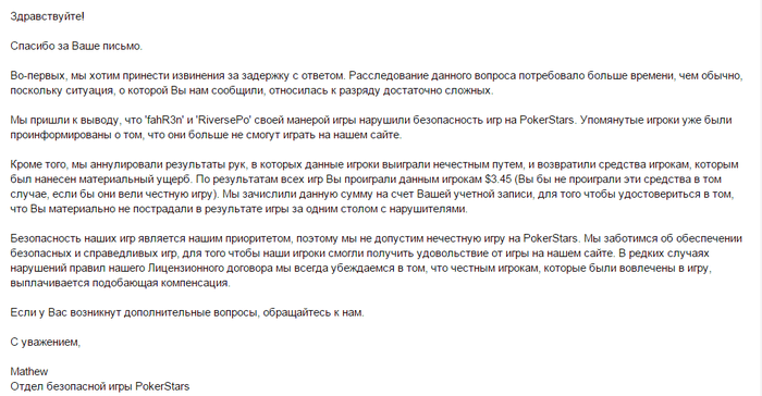 тех.П. пришла к выводу, что 'fahR3n' и 'RiversePo' больше не смогут играть на pokerstars